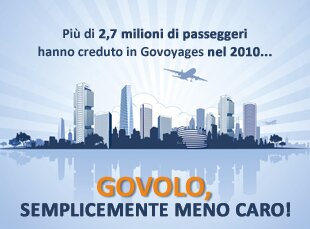 | I prezzi possono essere sottoposti dall'organizzatore e/o dal trasportatore a delle condizioni di vendita o di emissione particolari. Vedi le Condizioni di Vendita Immatricolazione Atout France IM 075 10 0338 N°IATA 202 29 252 RCS PARIGI 491 249 553 - RCP : HISCOX Contratto N° HA RCP0082196 Garanzia finanziaria : APS Tutti i prodotti proposti da Govolo sono sottoposti ad una garanzia finanziaria Questa protezione assicura prima di tutto i clienti. Voli | Soggiorno | Voli + hotel | Hotels | |